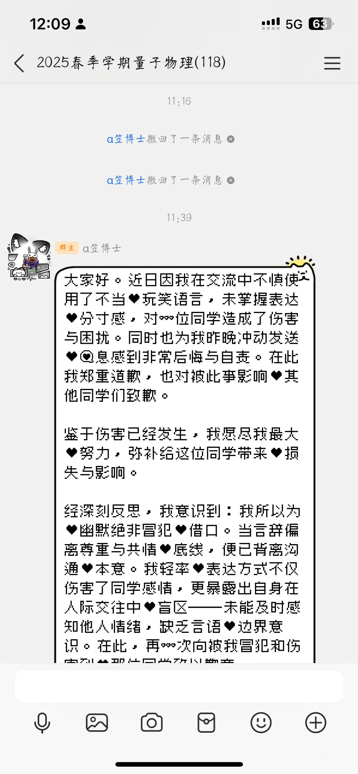 这次在课程群“2025春季学期量子物理”里发布的道歉声明,有一部分文字显示起来是心形符号,可能造成了大家的误解,这是因为我使用了付费的QQ装扮字体,我并没有混淆是非的意图。