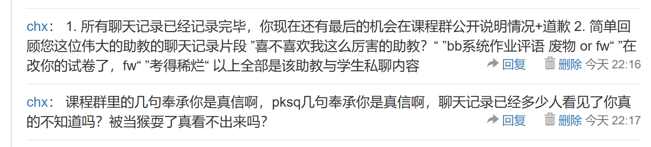 正如mmd学弟所述,“侮辱及贬低学生的学习或研究”在《助教手册第四版》的负面清单当中。即使助教与学生存在个人恩怨,都不应该在助教工作中辱骂学生,尤其是在专门用来收发作业的bb平台上,这是公报私仇。