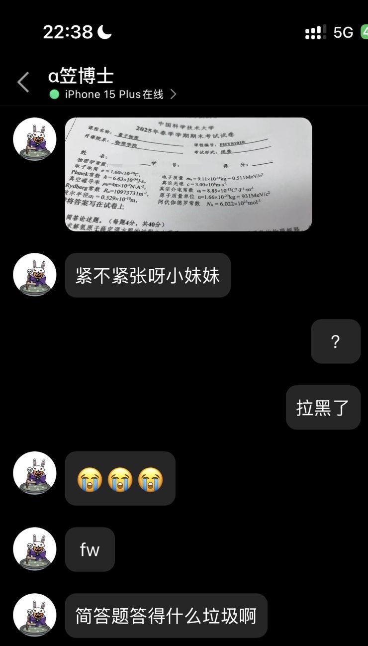 2.实时直播改卷并时不时羞辱几句,注意当事人第二天还有别的考试。在被拉黑后依然想法设法对她说“你考得很差(后面加几个大笑的emoji)”。如果真是开玩笑,我真不知道情商低到什么程度才能在都被拉黑了的情况下还没反应过来。并及时道歉。