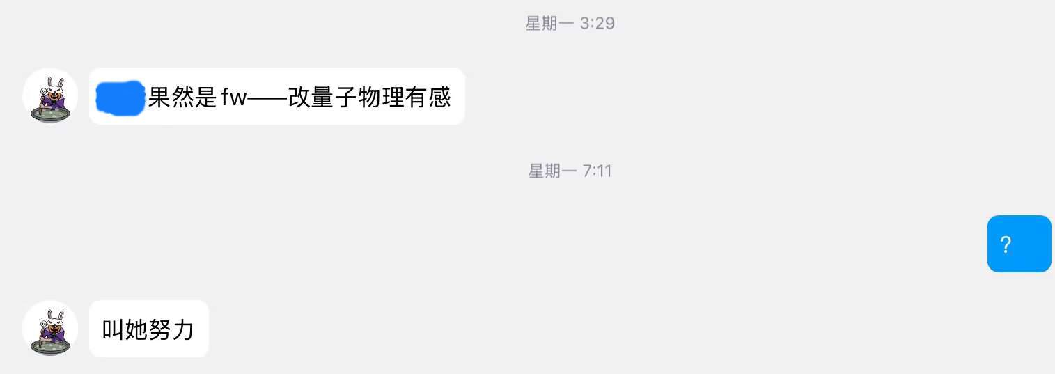 两位助教是我见过的最好的助教,十分细致负责、亲切亲民。如果你想正经学量子物理,两位助教会给你详细的资料,如果你只是想混个学分,两位助教也会提供力所能及的帮助,甚至和你一起吐槽zkd的奇葩课程。量子物理群在期末之后,在大家的自发组织下,一度还成为了随机过程和离散数学的复习群,这样的氛围非常棒。他们让我被AI英才班勾十置课塞满的大二下学期竟然在量子物理上找到了乐趣,最后出人意料地还算有不少收获。