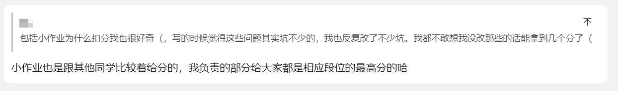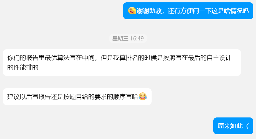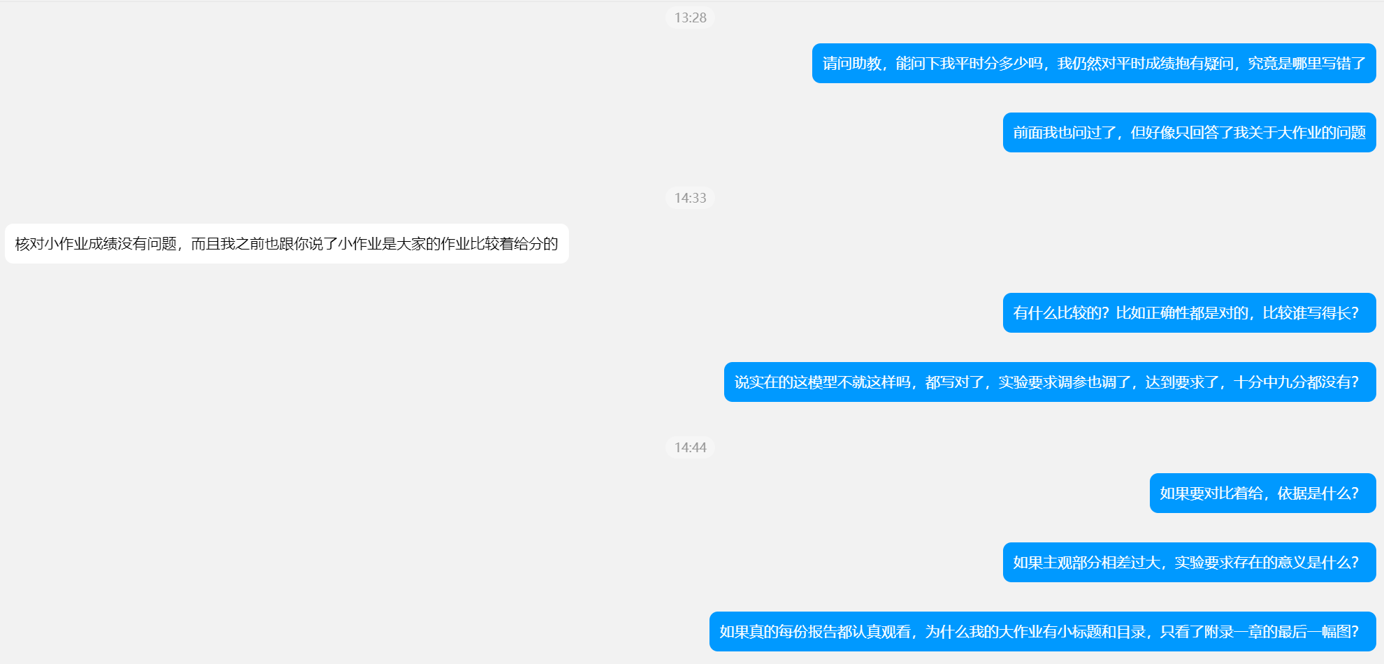 虽然老师并未回复我,但第一位助教在老师已读后的 20 分钟后回复我了:说我是大作业成绩太低。我说我打得还行啊,也有认识低一点点的同学总评挺高啊。然后才发现真相是: