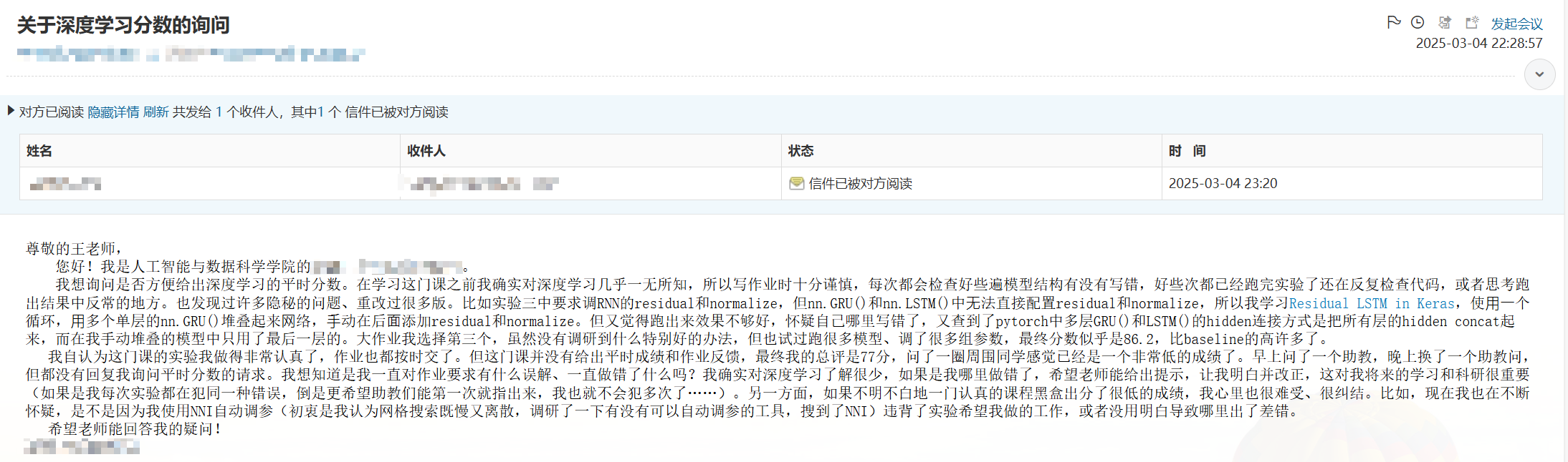 3.17 update:都不回邮件,我放弃了。研究生课确实是草菅人命,没处说理。不建议认真写这门课的实验,毕竟实验文档说不定都是 ai 随便写的,既无设计也无引导。不建议像我那样感觉有小问题就重新训练,反正写的东西又没人看,估计实验报告就拉到最后看下页数。精力还是拿去做做国外的实验或者科研比较好。