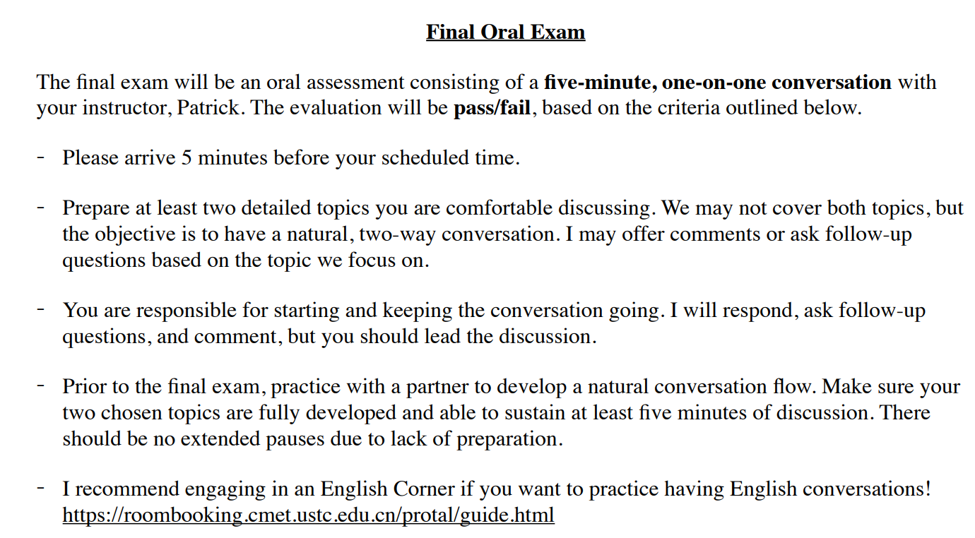 2025春季学期选修此课。所有科大硕士生都必修一门英语口语课(从《日常交流英语》与《学术交流英语》中二选一),虽说六级口语过的同学可以不用选,但我的英语实在不好,所以不得不选修。这学期我本来打算在这门课与Richard Helder的《学术交流英语》中选修一门,后来因为组会时间与R.H.的课重合,选择了Patrick老师的日常交流英语。后闻R.H.的《学术交流英语》作业极多、平时任务琐碎繁杂,甚感庆幸。