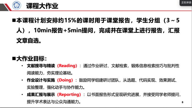 课程概况:本学期该课程共开东西两个课堂,高新区暂未开课,导致高新区同学的到课率比较感人。教学方式为负责课程的三个老师每人上五次课,课堂介绍生成式人工智能前沿知识和各种机器学习的背景内容等等。本课程从第二周开始上课,上到16周。西区课堂由于答辩时间压缩,15周即完成了所有课堂内容。