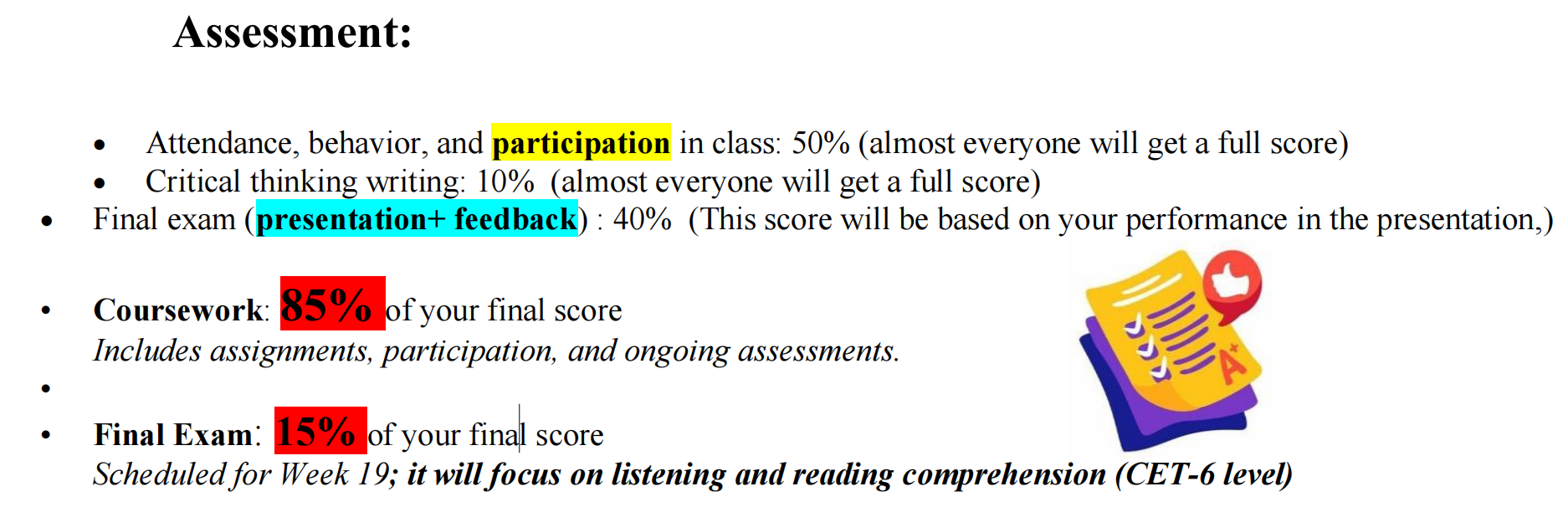 实际上加了期中考试(类似雅思口语PART II,2个问题3min答,会有准备时间)。期末考试是自己选择一个话题然后上台做展示(time limited to 3min, PPT highly recommended)。
