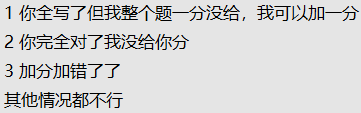 评分标准则可能是继续奉行其批作业时的正确方法唯一论和过程正确无用论,但是由于完全没有评分细则所以不好断言。与其他百人大课一天出成绩和评分细则的效率相比,很难不怀疑wcy是否是像批作业一样在登成绩前一夜随手批完了期末考卷。