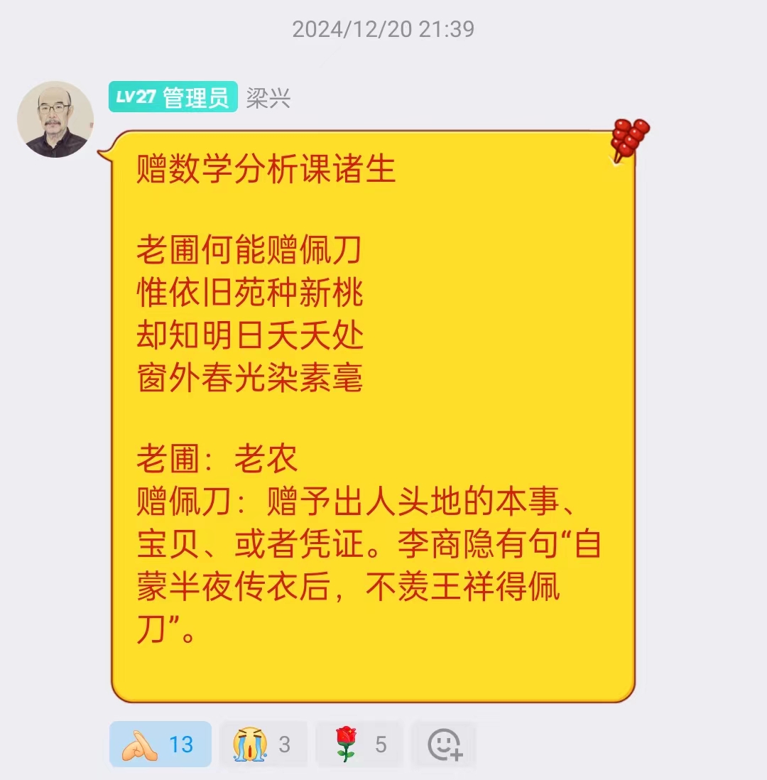 说点别的。其实吧,只要我不说,大家一般也猜不到我具体是哪个年级,于是乎我便成功混身于学弟学妹之间长达半个学期,只可惜期中考试前某次取作业的时候身份暴露了,虽然如此,大部分人仍然还是不知道我的身份的,这还是很好玩的。大二学过复变,有时候葛助教还会给我推荐一些复变函数求积分的方法,这一点直接点赞助教!!!看着学弟学妹们的样子,仿佛看到了我当年的模样,有的时候真有一点“览物之情,得无异乎”的感觉。在开学之初看到很多特别认真的年轻人,也非常欣喜地发现到学期末你们依旧认真如初,真的恭喜你们!重新经历了这一遍数分的学习,也在课程群里重新体验了一波当年的感觉,看到了很多非常可爱的学弟学妹,这点对于我真的是一点非常宝贵的回忆,真的还是很令我回味的!也正因如此,我还是非常想日后也能成为助教什么的,只不过不确定有没有机会了,希望可以吧!(当然,值得注意的是,我并不是说重修是件好事,毕竟首先重修数分这样的课还是会占用不少学习时间的,而且可能还会有身边的同学都考完试而你还在刻苦复习的情况,大家还是要理性看待的)