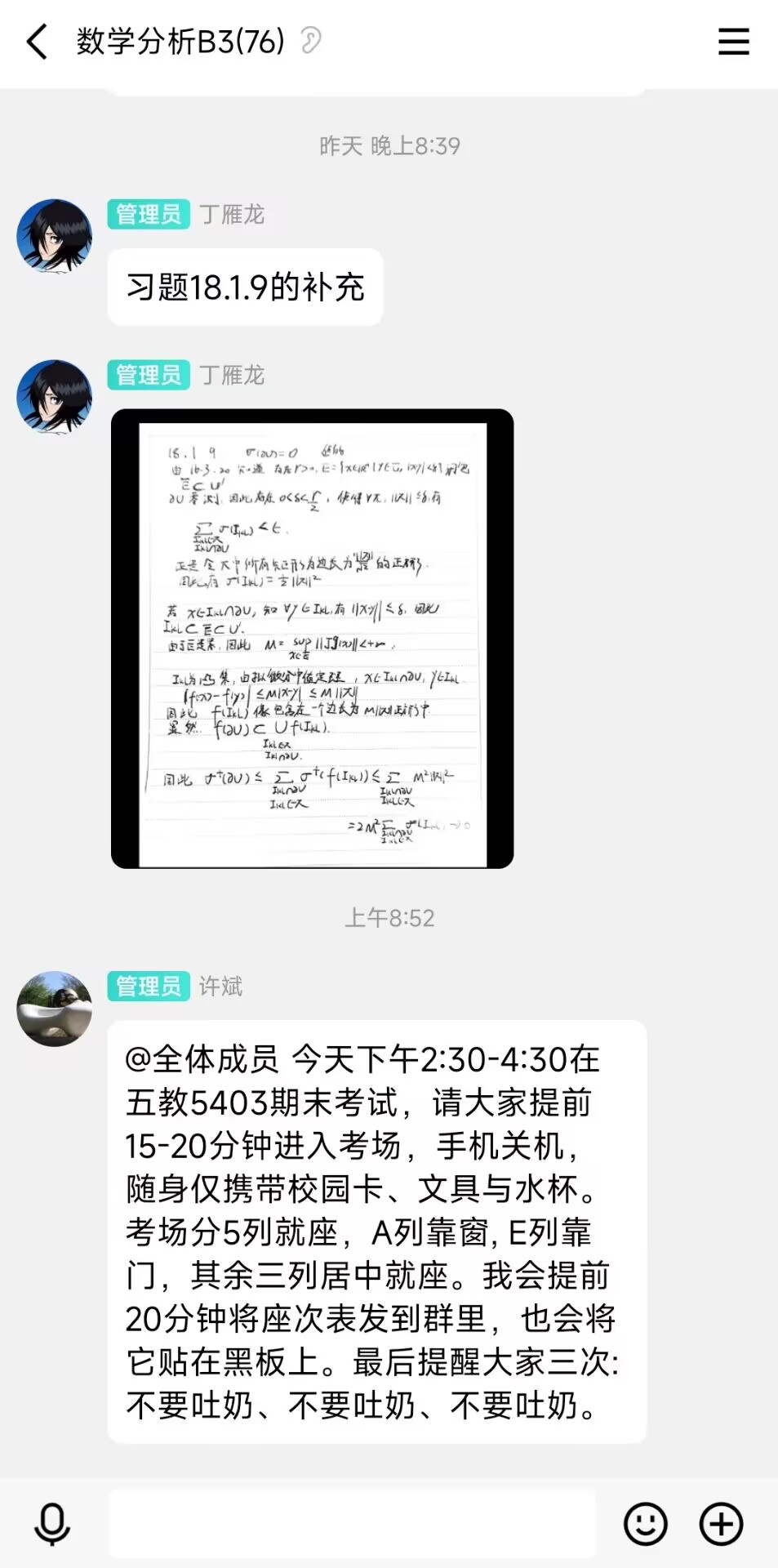 老师自己编的讲义前面很多都是翻译 The Way of Analysis,其实我觉得这本书写得真的真的挺好的,但发现到多元微积分的部分,许斌老师就开始夹带私货(黎曼几何???),我清楚的记得说曲面和第一微分形式、对偶的时候我整堂整堂课的听不懂。而且这些听不懂的内容期末考试也不涉及,可以说是浪费了大量时间在没有必要在这门课上讲的内容上,导致了最后积分部分讲得非常潦草。