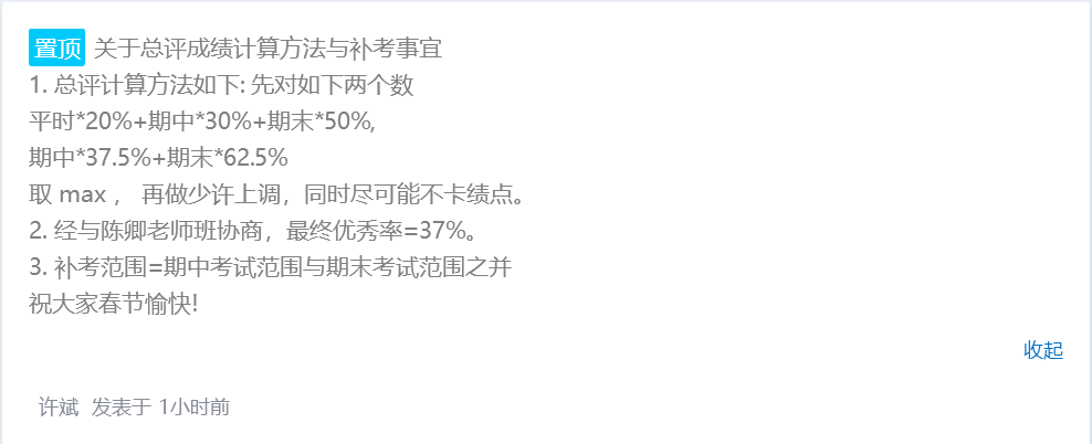 总评=0.2平时分+0.3min{期中,期末}+0.5max{期中,期末} +2(这个+2就很有灵性),卡绩会微调,优秀率和cq班一样给到了30.(但好像cq班是235给分,没有这个+2)