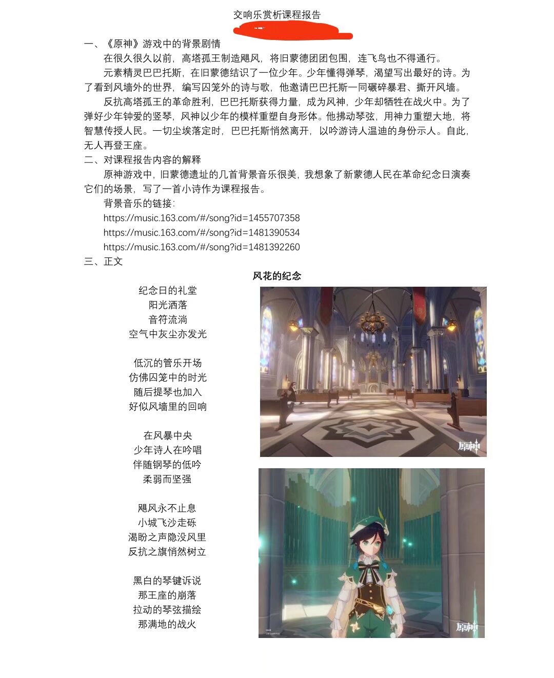 论文:300字+即可。真的是一门大水课了,只要按时提交就至少有3.3,认真点写都能上3.7+。这次的题目是《音乐的思想》,其实我是钻了空子,没有写交响乐也没有写很多的思想,只是写了点自己听《白马村游记》时的感触,以及一些回忆等等,主题其实都是硬扯上去的。可能这种课其实写一点自己的感悟比各种百科资料要好得多吧(