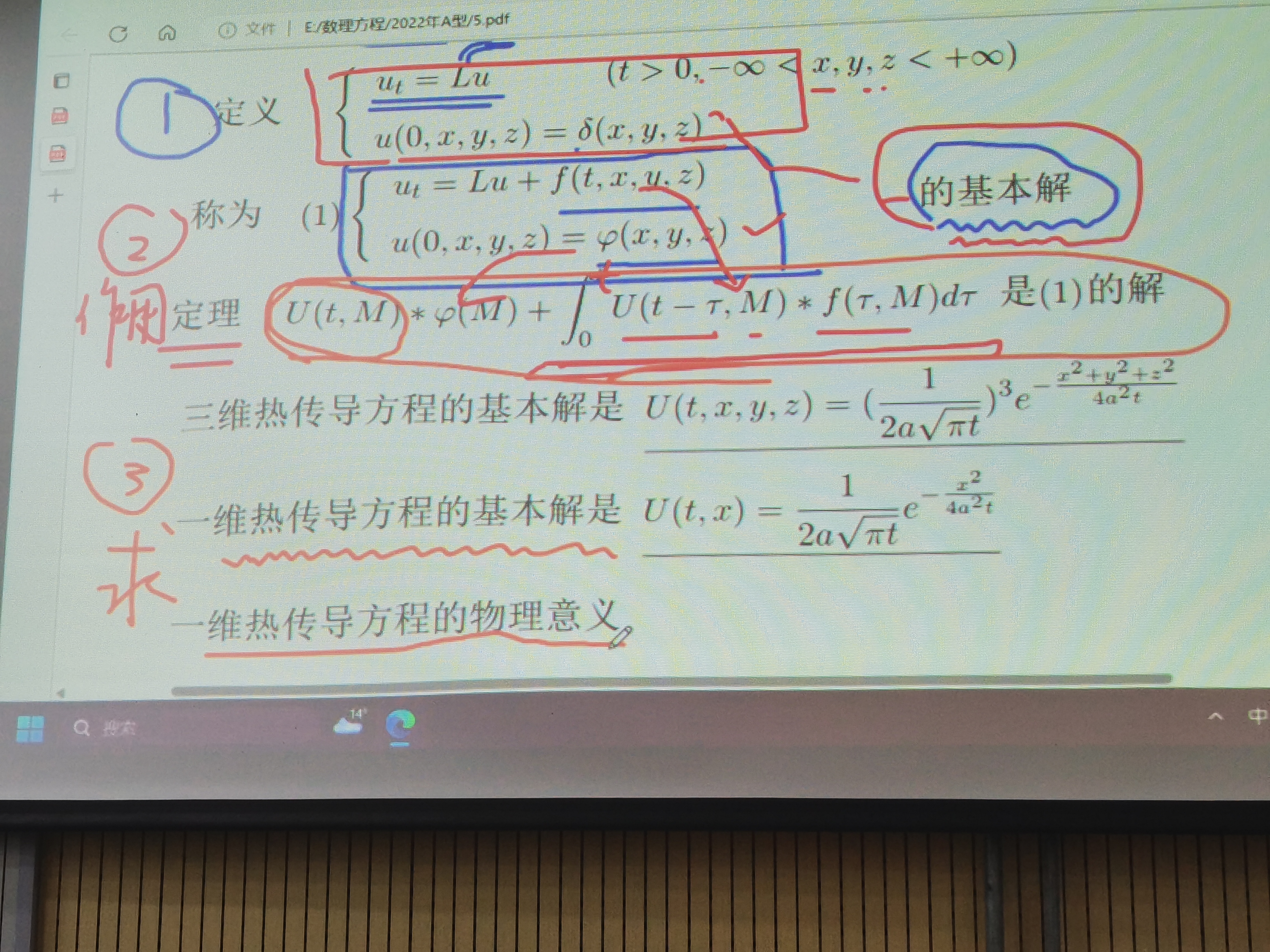 说到考试,计算量确实大,但是有很多方法简化的,比如第4题,影响里书上是有原题的,分离变量讨论一下取值,但作为考试题确实有点恶心人,然后第7题,傅立叶变换的,如果先写出一个特解将非偏导数项消掉,再用傅立叶变换后再反变换,你会发现异常简单,况且复习课宋老师还说了常见卷积的结果,大大减少了计算量,比用基本解再去变换反变换再套基本解简单了不止一点,再说第8题,无非数分里找个对称点,甚至高中就会的东西,其他的直接套模板写就好了,其他的题还是很常规的。总得来说两小时内写完这套卷子还是有些挑战的,倒不是多难,而是计算量确实有点恶心(感觉这课也只能在计算量上恶心你了)。在老师改卷放大海下卷面分应该至少75是有的(好好听课的话)。