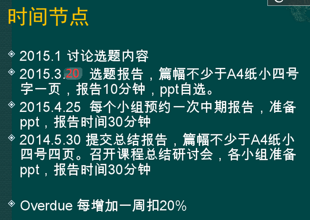 这门课算是自由度比较大的课程,课程要求和导师有很大的关系。比如我们是这样: