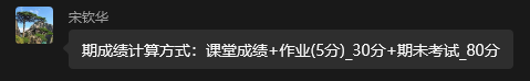 学期末给的总评算法:期成绩计算方式:课堂成绩+作业(5分)_30分+期未考试_80分(老师原话,这能看懂简直神了)