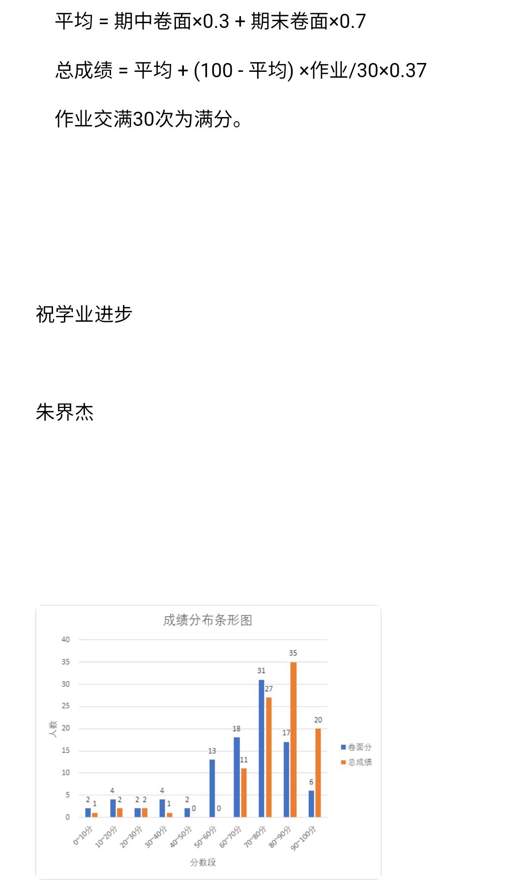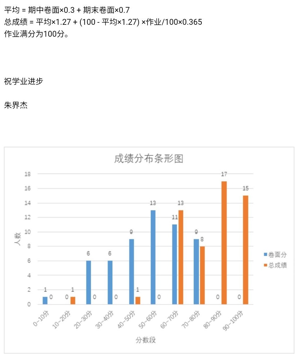 至于给分,朱老师有自己的调分公式。对于自学的同学或是听课的同学都非常友好了。平时分很容易拿满(即使作业中很多题目不会)。给分情况文末有附图,可以看出给分相当不错。当然这学期同学们考得都很好,和往年比起来没有那种大幅提升的感觉也很正常。