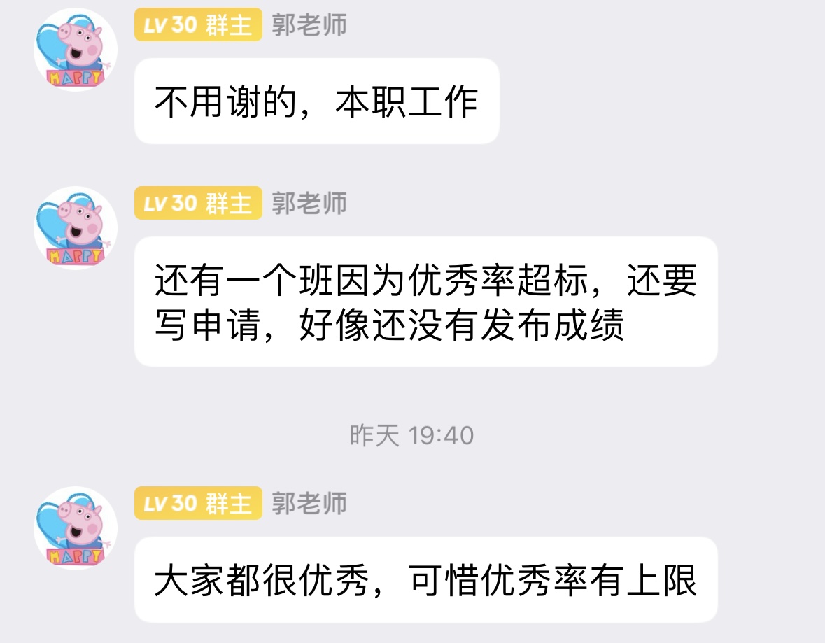 郭老师被评价为“敬业+幽默+超耐心”,尤其是在答疑上,老师活跃于课程群,积极解答学生疑问。总的来说,学生对于老师的教学水平给予了高度评价。