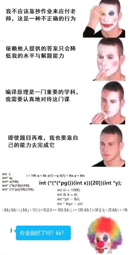 当然,说白了,与这些相比,实验要求朝令夕改、考试偏题怪题频发才是最大的坑点。我的确认可郑老师在某些方面所体现出的责任心(比如考完试亲自改卷),但这门课也确实极大地消磨了我对编译的热情。也请各位不要抱有任何的侥幸心理,本学期的期末考试出了一个莫名其妙的C数组写法,而这道连环题一旦没猜对就是整道大题直接降一个总评级别的失分。而这个莫名其妙的写法,在此前任何郑老师的讲课、PPT、作业、教材里都没有任何提及。