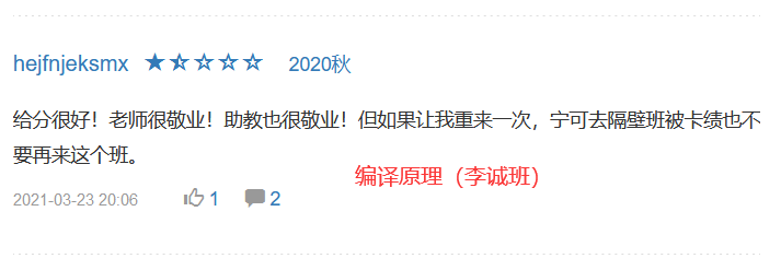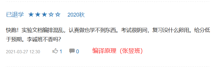 刚出分来评。 结论:强烈不推荐。 1、习题课几乎没有,整个一学期就两次,助教也超级不负责,期中成绩到期末还没出,群里提问大多数也就装死。看助教回复期末卷子还是老师改的?不知道是老师第一次授课还是什么,感叹助教的工资拿的真容易。 2、实验要求反复横跳。老师给了一个祖传的PL0文档,给了乱七八糟的一堆样例。样例和文档甚至还有冲突,最可笑的是都开始检查了居然还能临时追加样例的?这实验要求就不能一次性给完吗?离谱。 3、作业机械暴算。作业都是常规知识的运用,最大的特点是暴算,计算量爆炸。和考试特点一样) 4、考试题目离谱。非常喜欢考C语言知识,建议下学期老师带程设。期末两道大题考数组声明,就是那种可读性极差的数组声明。纯粹就是为考试而出题,如果你C学的好就全对,学不好就全错。而且非常喜欢连环题。 5、几乎不调分。期中95,期末估计75-80(错了两个pl0)最后总评90