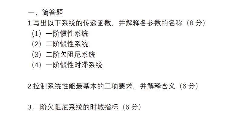 这门课东西看上去很多,事实上也不少,主要是有一些东西比较细。卷子是老爷子出的,最后会说一下大概考什么内容。这又是一门考教分离的(严格来说是作业和考试分离),这门课应该是自动化专业的核心了,还是要好好学的,重点就是3种图的绘制这种,本次考试有一些问答题,和往年的简答题一样,可以见下图,这个古灵精怪的小老头特别喜欢PID,尤其是用什么PI,整定这种,建议上课好好听,课本什么有的好像没有或者非常简略。大题还有一个电路放大器相关的,应该要用基尔霍夫吧,建议尤其找一找这种电路放大器的模型看一看。建议作业不要太认真。因为期末很可能背刺你。幸好没有太认真的写作业。如果根轨迹这种不是很会写的话,去西图找一本自控原理的习题讲解应该会比干看书好不少。(这门课花时间看看教材可以可以学的差不多了)