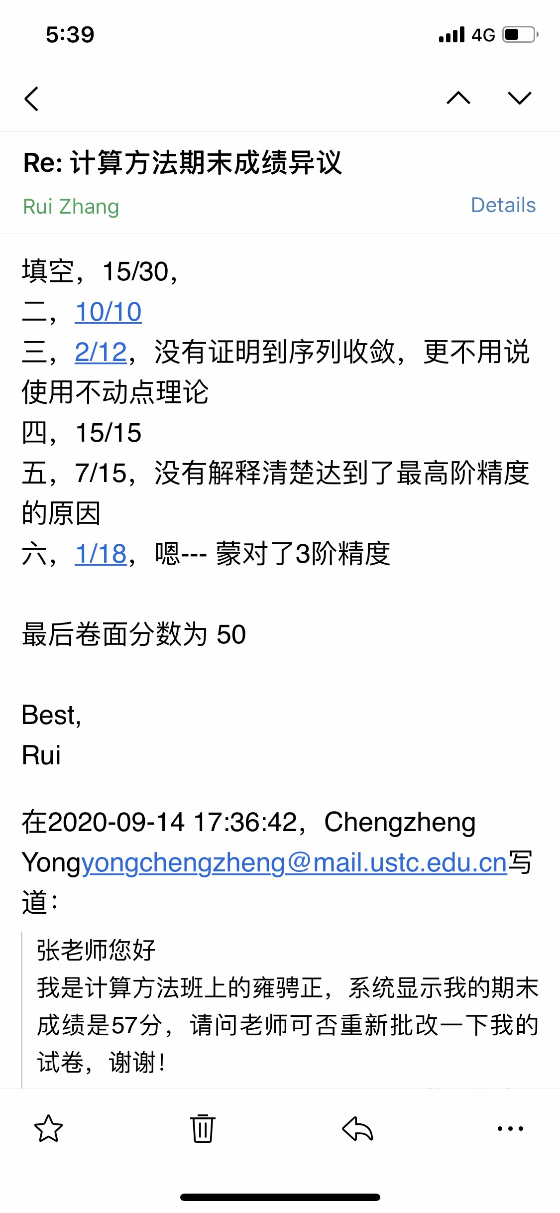 于是我就查卷了(首先声明,我并不喜欢查卷,我总共只查过单变量多变量力学三次卷,而且是老师欢迎我们去查)。老师几乎秒回。