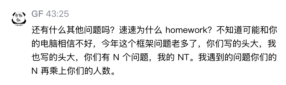 课程也不是没有缺点。assignments中使用的框架没有紧跟时代,有些老库用起来非常难受,但也就是些小问题,没有什么是一晚上不能解决的,如果没解决,那就肝到早上。