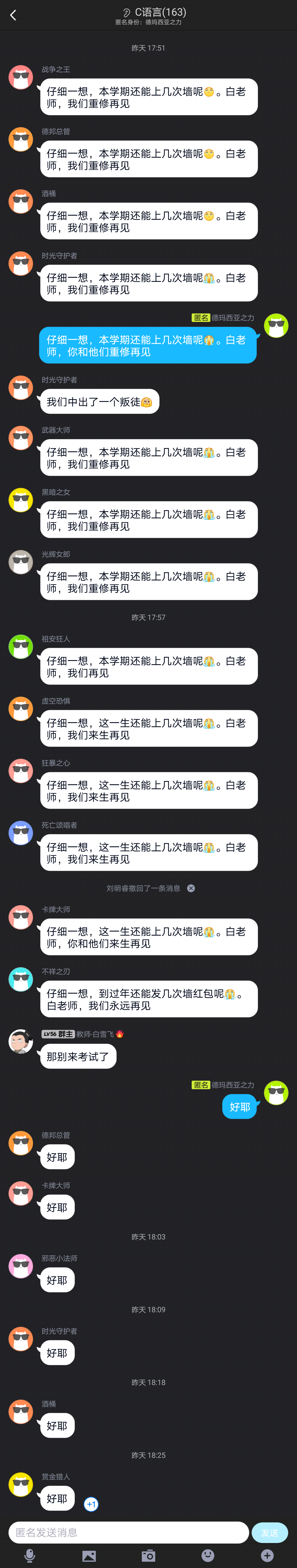 先说课堂,鄙人大一课表没地方放C语言,但是后来把力学咕咕咕去听过某院张老师的C语言,讲课天马行空,啥也听不懂,相对之下白老师讲课脉络清晰,ppt也做得很有章法,有问题的话可以在群里发,实名匿名小窗都可以,热心的水群老师会来解决问题的。
