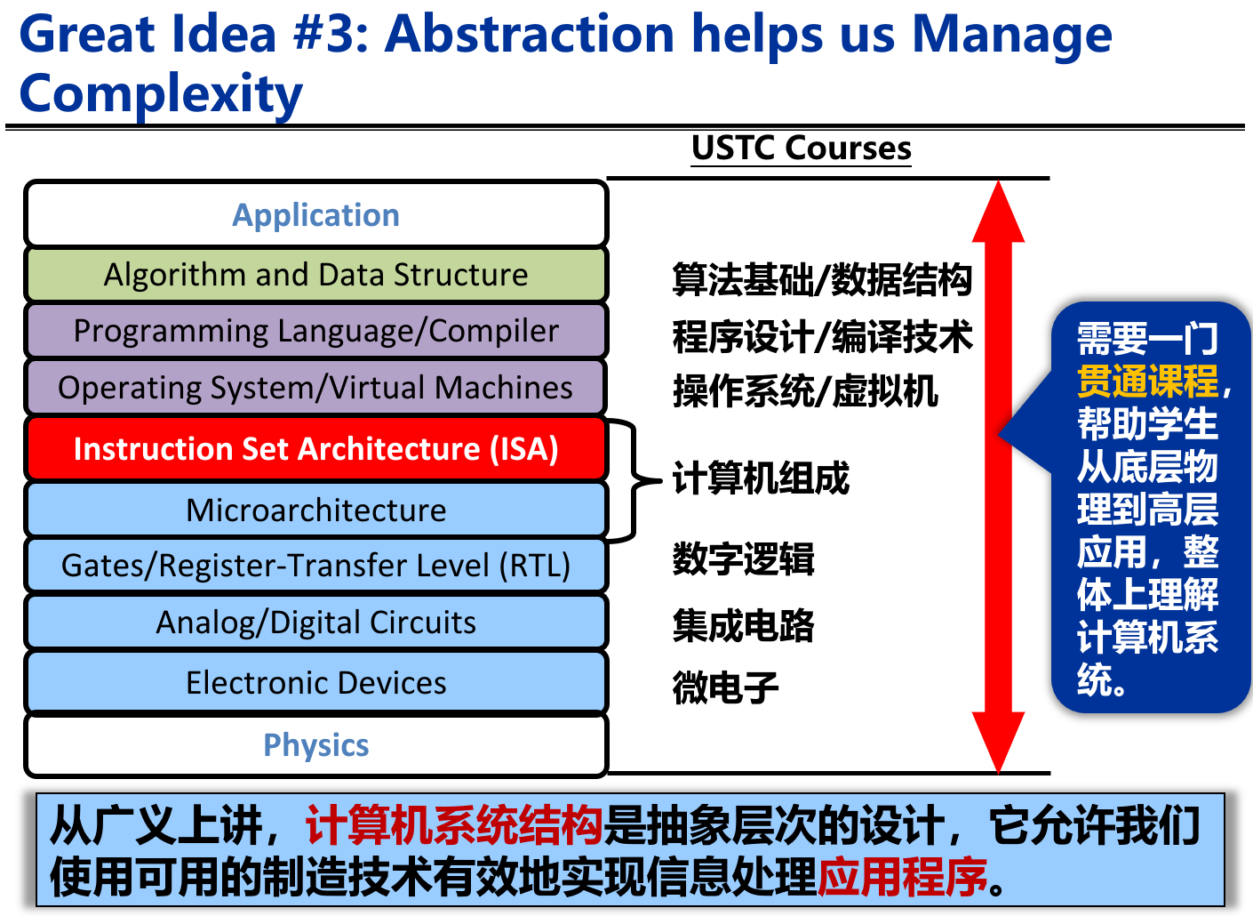 当然,如果这门课的内容是整个计算机系统的基础,那么提前学也是很有价值的。但事实恰恰相反。正因为系统的abstraction,无论是我们在实现OS的文件系统还是编译器的类型系统,都没有必要去考虑取指译码的数据通路。如果简单的编程需要考虑这些,恰恰是系统设计的失败。在考虑系统layer的某个特定问题时,通常只需要考虑上一个layer和下一个layer提供的abstraction即可。这才是真正的level of abstraction。并不是说知道怎么造计算机就能帮助解决计算机科学的所有问题。恕我再引用Dijkstra的话。