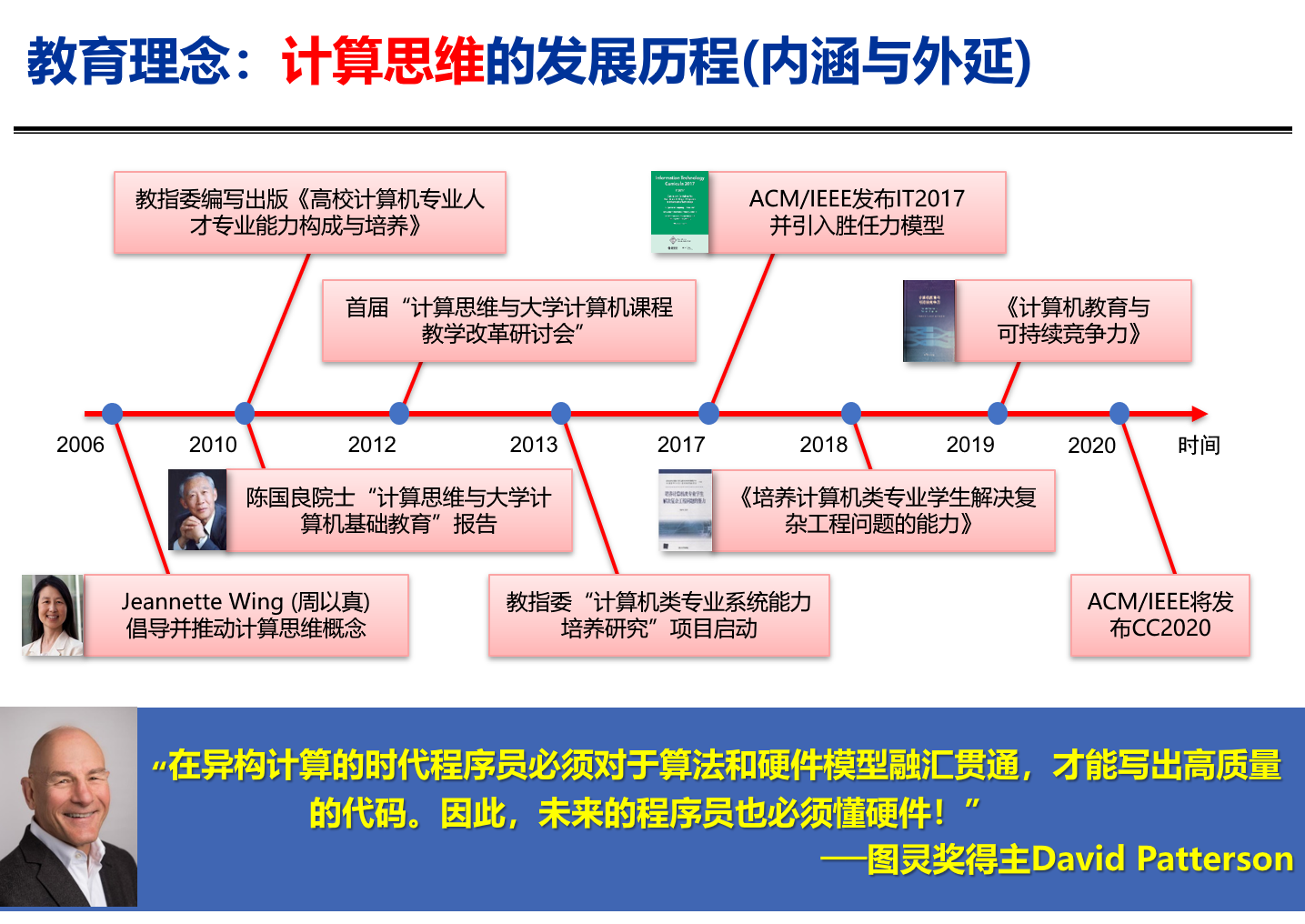 这门课中还提到了计算思维,引用了图灵奖得主Patterson的发言:在异构时代的程序员必须对于算法和硬件模型融会贯通。计算思维其实是由Jeannette M. Wing在2006年提出的。其中最显眼的一句话是: