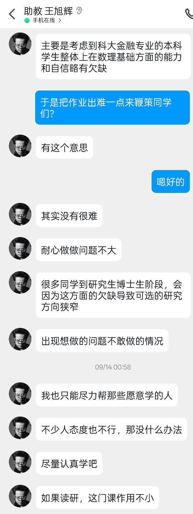 btw,上机课是啥也不教的,群里除了极难的数学作业和官威口吻的通知是啥也没有的。电子教材没有,习题课讲义没有,作业答案也没有。你让金融系的学生学什么啊?学您的高级计量经济学吗?陪您一起完成科研任务吗?不要再祸害科大本科生了,这门课没有研究生,不会跟您抢奖学金名额的。