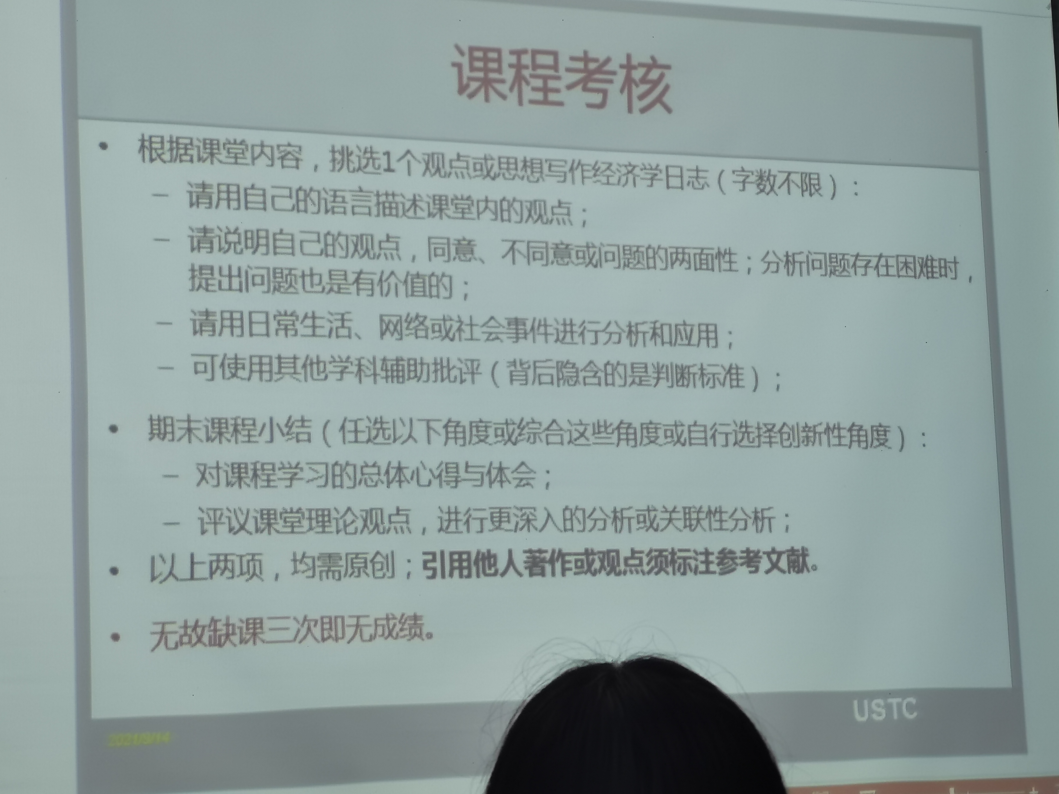 课程平时不会点名(可能老师在开课时发的用来记笔记的纸有点名的作用?),考核方式就是期末的两篇论文,一篇是课程总结(“一面”),一篇是有关具体事件运用经济学知识分析(“一点”),我两篇都在2000+,“一点”写的有点仓促,论述的不是很清楚。最后总评3.7,已经很感谢老师啦。推荐大家选课!