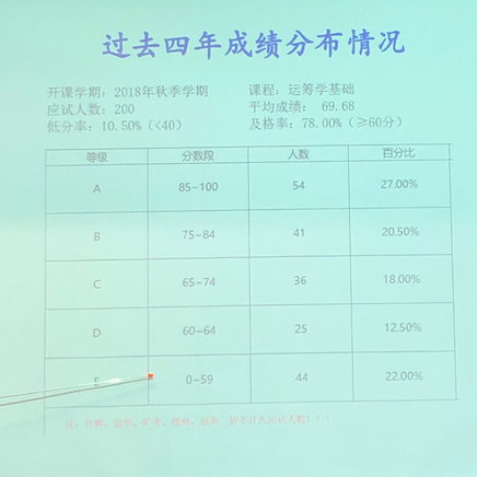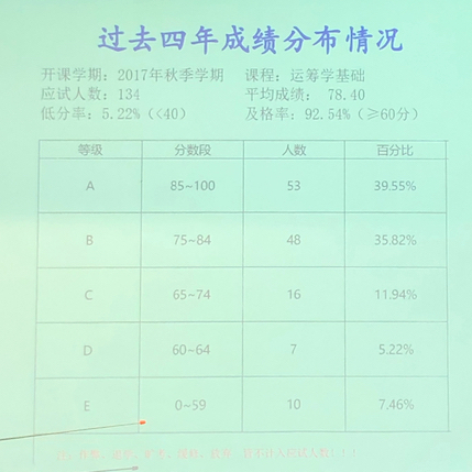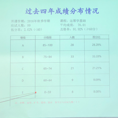 老师第一节课会把往届的考试成绩分布公布出来,最近几年考试貌似有难易交替的规律。他还说过很多次:“我很看好你们这一届啊“,结果好像不尽人意。总的来说,老师上课讲的挺好,课程作业量中等,给分感觉一般,考完助教说会通知查卷,结果却是直接出分,挂了一批人。