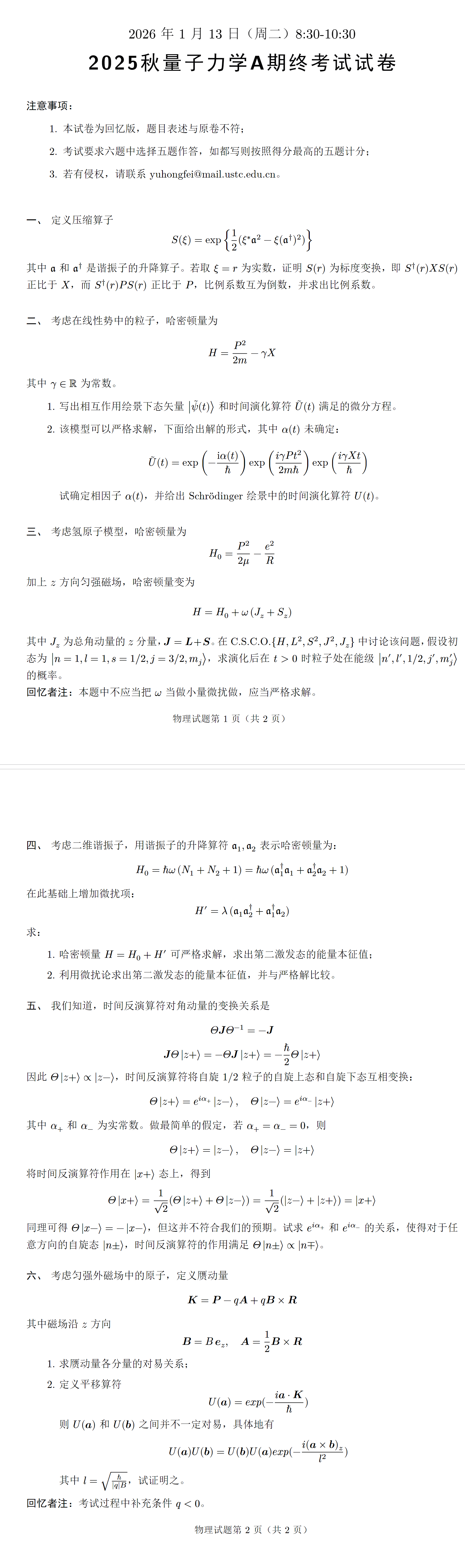 关于考试:由于课时损失,老师把含时微扰从考纲中删掉了。我确实爱死这六选五作答的安排了!本人期中期末都恰好有一道大题0分(因为确实不太会),但都因为六选五取得了不错的成绩。顺便一提,考试是开卷的。
