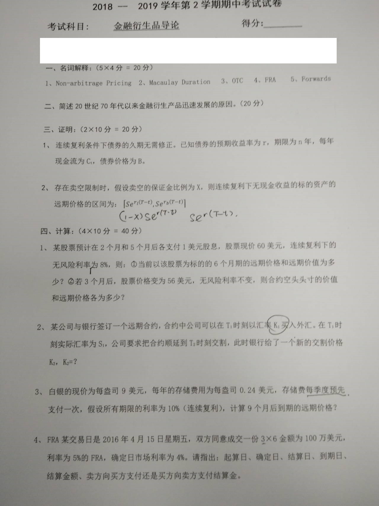前面学长说的很详细了。这门课大部分时间在讲远期合约和期货,期权两次课,互换一次课。考试和货币银行学如出一辙,只考老师讲过的,期末大题都是讲过的,选择题稍微能拉开差距。另外补充一份期中的开卷且可以带手机的考试题