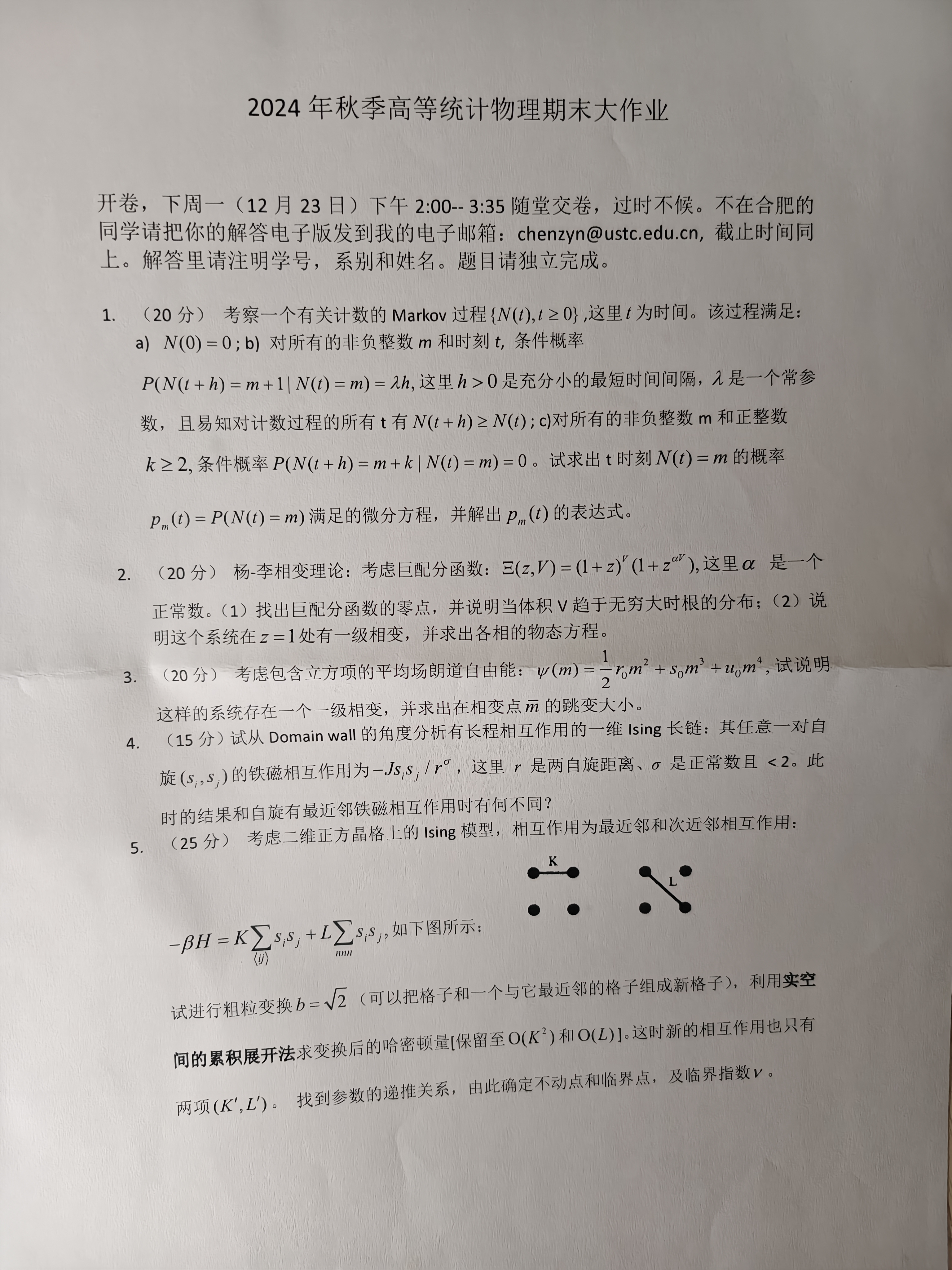 无点名,无作业。老师讲课主要是念ppt。这门课很好地补充了科大概统和热统A里边的“漏洞”(如特征函数、随机过程和主方程、朗道自由能、平均场理论等)。
