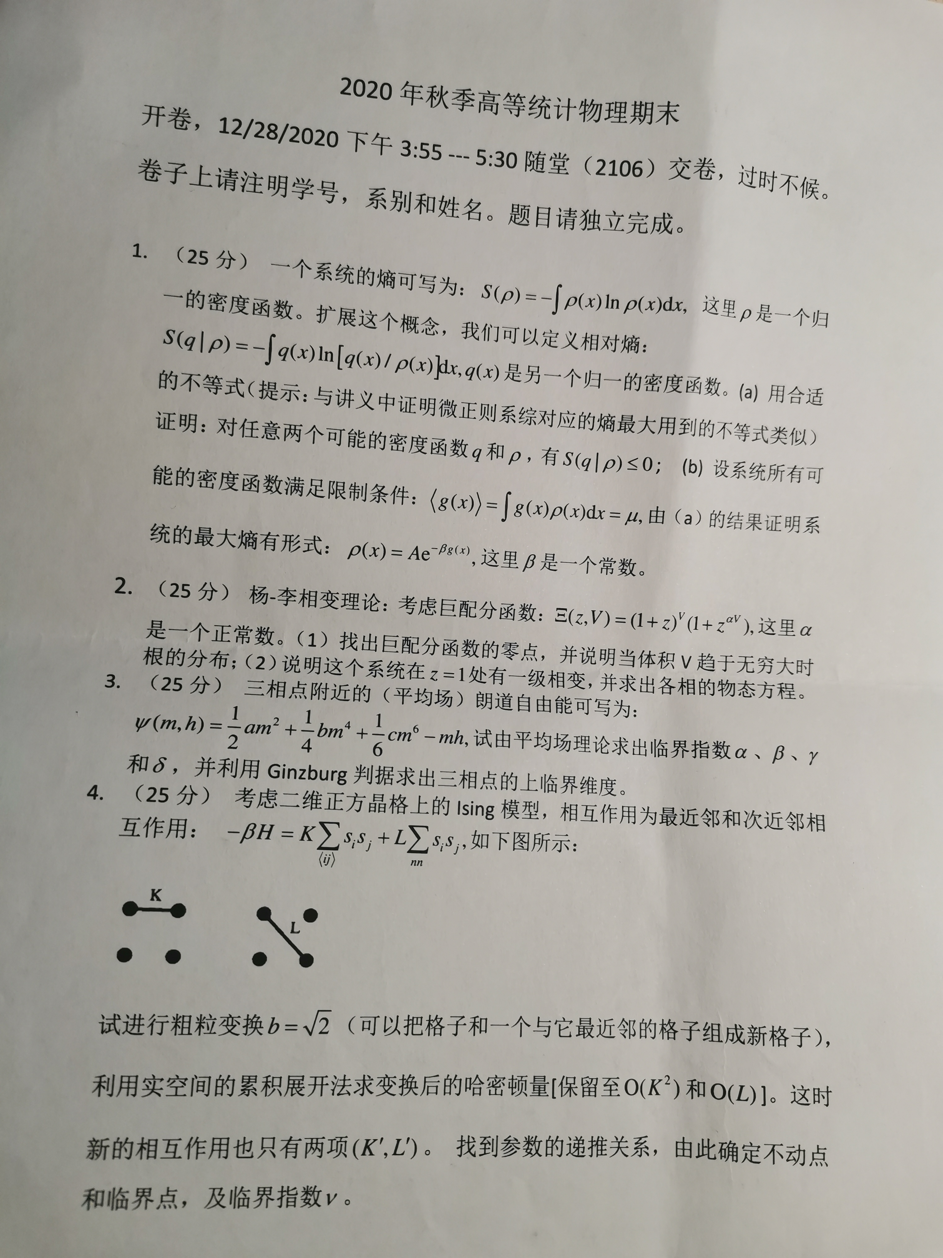 期末考后两个月,发现自己基本上不记得学了啥。只记得学到了点重整化群以及集团展开,对于杨展如那本书上具体研究的那些model都没啥印象。哦还有相变的general理论以及landau的平均场相变理论,可能其他内容都不在我的兴趣点里。