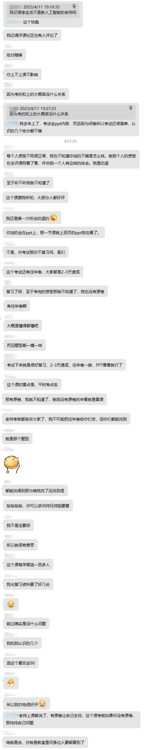 写评原因:可能因为我这门课得分我比较满意,所以我感觉这门课还是不错的。但是现在来评课社区一看,今年居然这么多差评。我反思了可能主要是这两个原因:1.每周两次课,且都是早八,部分人可能起不来 2.每堂课都小测签到。两个原因加起来,就会出现部分人偶尔或经常早上没爬起来,导致错过小测签到,拉低了分数。(因为没有课程作业,分数就纯看 课题小测签到+期末考试),所以不来上课会损失很多分数。当然也可能有人有其他原因而打差评,比如对课程内容不满意等,这个就因人而异了。