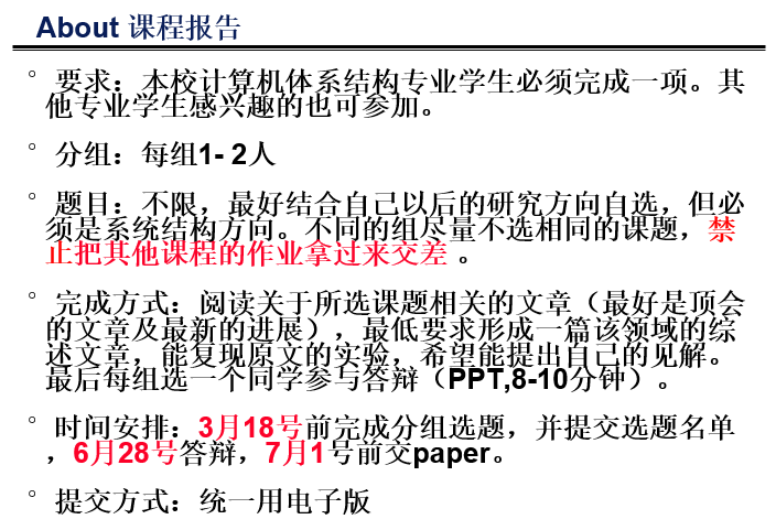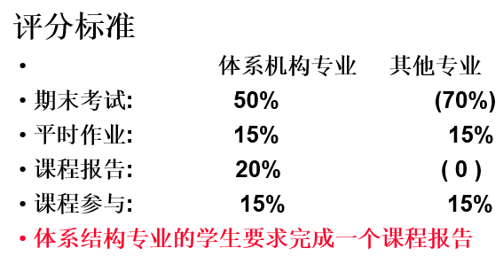 三次点名三次作业各占15分,体系结构专业同学还有20分的pre和50分的期末考试;非体系结构的同学只有一个期末考试占70分。老师上课基本就是念PPT,也不会和学生有什么互动。考试内容可以参考往年评价,基本都是那套祖传试题会有一两道新题,去西区买了资料的话考试成绩保底也能拿到8成;课程作业在网上搜一下就可以搜到,即使是自己做也都没有很难;点名的话还是很重要的,毕竟一次就5分,所以要选课的话最好还是来上课或者找个好兄弟轮着来。本人非体系结构专业所以对pre的难度和给分不太了解。考前把买的考试资料和作业整理了一遍,又从头看了一下GitHub上找到的前辈的课程笔记(事实证明性价比极低,其实只需要掌握资料上的那些题型就差不多足够了),在缺勤一次点名的情况下总评拿到了88,作为混子已经很满足了。