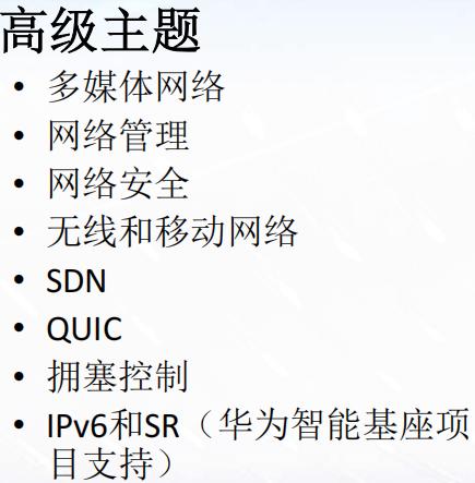 【授课风格】专题式讲解,首先用2~3周快速复习本科计网,然后参照top-down讲网络应用的领域,讲解还算充实。如果错过了一些课时,可以去B站找老师往年亲自录的课: BV1BL4y1J7vh 。最后放了华为专家讲IPv6和SR的往年录像。